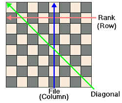 The chess Board consists of 64 squares - eight squares wide and eight squares long. The light and dark squares alternate in any row and the slanted squares of same colour are called diagonal. The chess board is placed in such a way between the players so that each player has white square in his lower right-hand corner. The rows that point vertically from one player to the other are called files. The horizonal rows are called ranks.